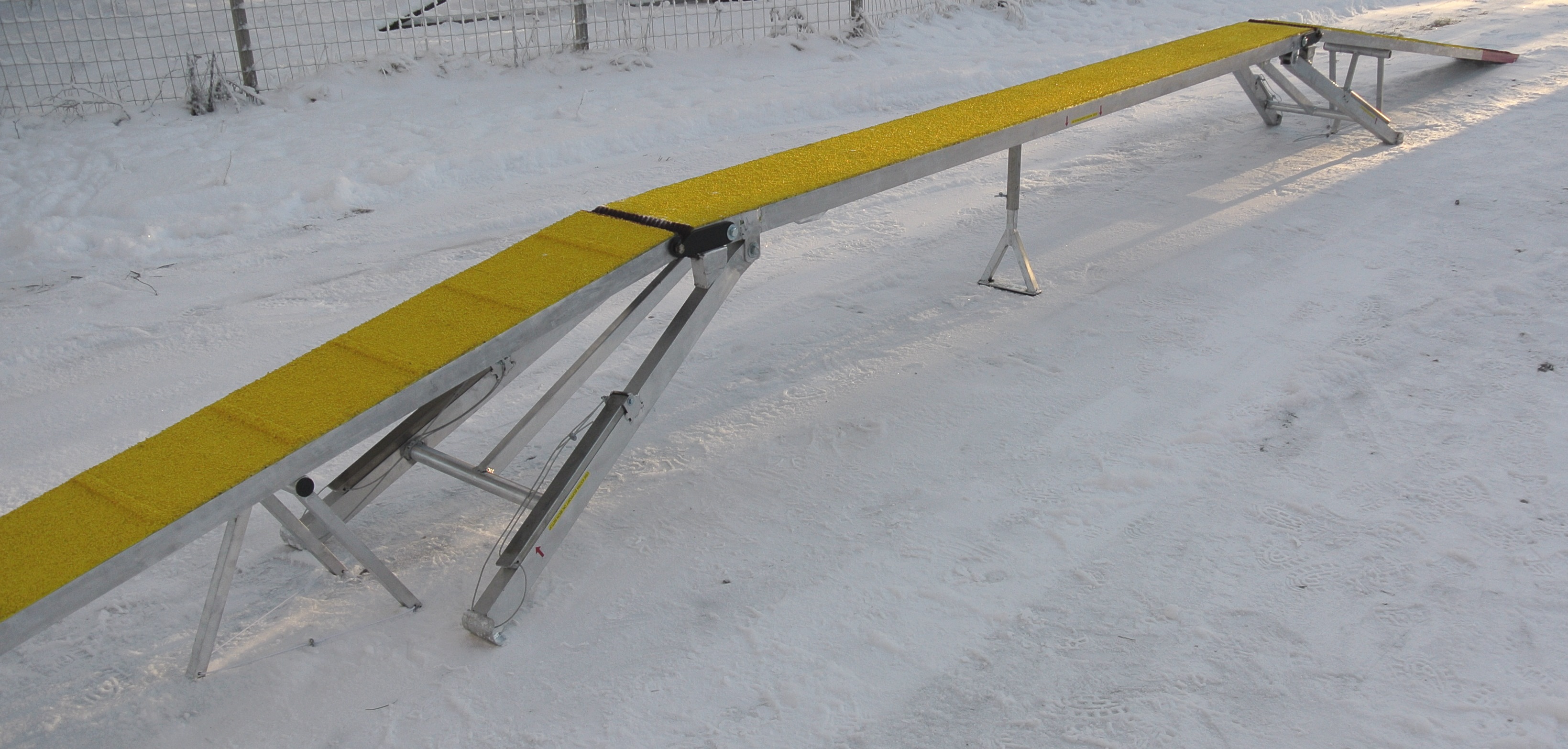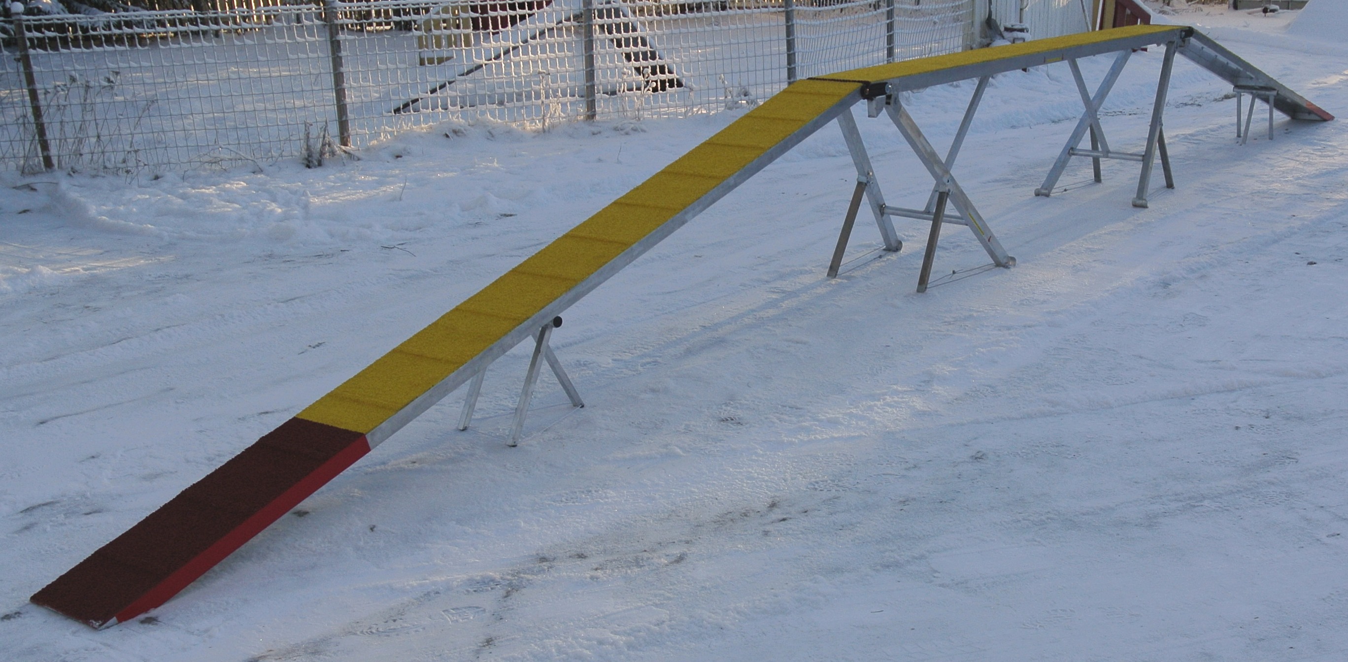The Adjustable Dog Walk requires a storage space of 3,7*0,6*0,35 meters. The obstacle weights about 70 kilograms.