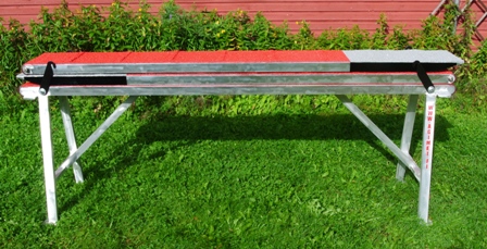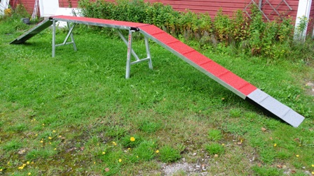 The obstacle is a downscaled version (2/3) of the competition Dog Walk by height (60cm) and section lengths (2,35m). However, for safety reasons the width (30cm) is equal to the competition model.