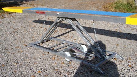 With automatic wheels, this obstacle is easy to move. The wheel are activated by lifting the frame and released by lifting again and pulling the release cable. This seesaw also features a spring assisted height adjustment and an adjustable descent speed. In the exit side there's a shock absorber that further eliminates the impact force.